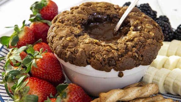 Élevez vos fondues au chocolat d'un cran avec cette recette de fondue au chocolat... dans un bol en biscuit géant. Décadent à souhait.