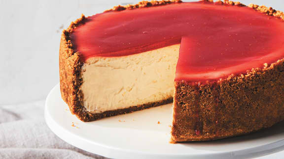 Difficile de trouver un dessert plus décadent qu'un cheesecake. Ajoutez à cela un nappage aux framboises et le tour est joué.