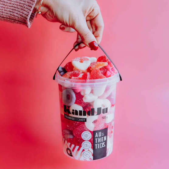 Faites plaisir aux dents sucrées avec ce seau de bonbons surs et sucrés à thématique de la Fête de l'amour.