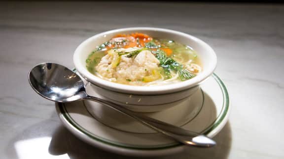 Le chef du restaurant Arthurs Nosh Bar, Alexandre Cohen, vous propose sa recette de soupe au poulet avec « matzah balls ». Cette spécialité issue de la cuisine juive se transmet depuis des générations et elle est surtout consommée lors de la fête juive de Pâque. Avec ses boulettes de poulet typiques, cette soupe traditionnelle vous fera découvrir un univers culinaire riche.