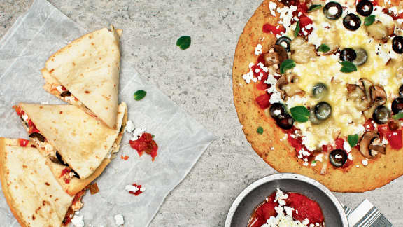 Vous n’avez pas envie de cuisiner une pizza avec une pâte traditionnelle? Optez pour cette recette de calzone express hyper santé! Des tortillas au lieu de la pâte à pizza et des garnitures savoureuses : de la salsa, du fromage cottage, du cheddar fort, des champignons, des olives, un filet d’huile d’olive et de l’origan. Le repas sera prêt en moins de 15 minutes.