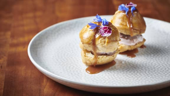 Voir la recette : Petits choux farcis de crème glacée et de caramel à la fleur de sel