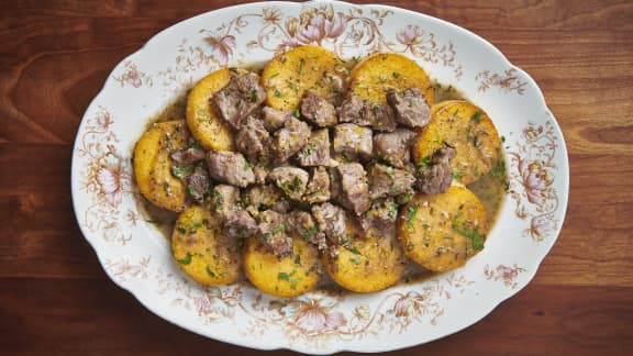 Stefano Faita prépare un ragoût avec des cubes d'agneau qu'il fait rôtir quelques minutes avant de les déglacer au vin blanc, de l'ail, du romarin et qu'il laisse cuire environ 30 minutes avec du bouillon de volaille. Une recette plutôt simple, mais tellement savoureuse !