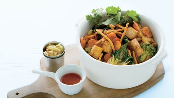 Cette recette du chef Antoine Sicotte est un véritable vide-frigo. Parcourez votre réfrigérateur à la recherche de légumes. Bok choy, carottes, champignons, brocolis; prenez ce qui vous tombe sous la main. Marinez un morceau de tofu à votre goût. Dans une poêle très chaude, faites revenir les légumes dans de l’huile de sésame avec le tofu. Ajoutez le gingembre, de la sauce piri-piri, l'ail, la sauce soya et du jus de lime. Pour terminer, servez le sauté avec des nouilles croustillantes.