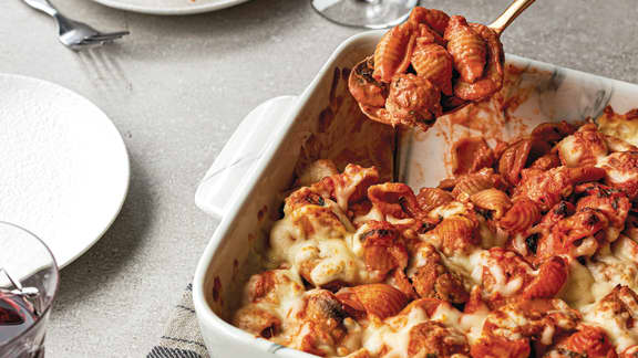 Voir la recette : Gratin de pâtes aux tomates, aux champignons et aux saucisses