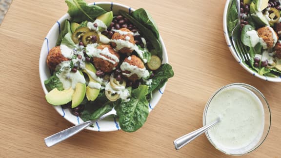 Répartir la laitue, les haricots noirs, les avocats et les boulettes de quinoa dans des bols de service. Garnir d’un filet de crema.