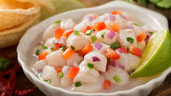 Déposer les pétoncles dans un grand bol adéquat, presser le citron verts dessus et assaisonner au goût avec le sel, piment et huile d'olive. Laisser cuire sous l'effet du jus de citron et du sel.