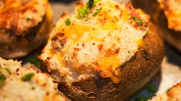 Une fois cuite à votre goût, sortir et couper une calotte sur le dessus. Prendre une cuillère et vider la pomme de terre. Mettre dans un plat. Répéter pour chaque pomme de terre. Réserver les coquilles.