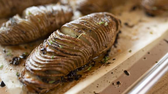 Sur chaque pomme de terre, faire des incisions perpendiculaires à la brochette à 2 mm d'intervalle et transférer sur une plaque de cuisson.