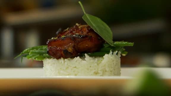 Déposer un emporte-pièce dans une assiette, remplir l'espace de riz puis retirer l'emporte-pièce. Déposer quelques haricots verts sur le riz et surmonter d'un ou deux hauts de cuisse. Répéter pour les autres assiettes et servir.