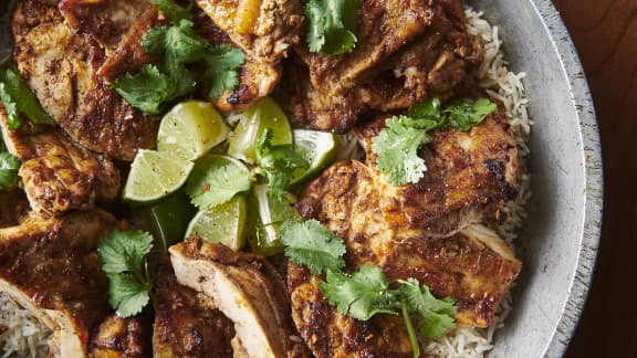 Dans un autre grand bol, mélanger le reste du mélange d’épices, les 2 cuillères à soupe de jus de lime restant et le sel. À l'aide d'un couteau bien aiguisé, marquer légèrement le côté peau de chaque morceau de poulet, en faisant 2 ou 3 incisions peu profondes à environ 1 pouce d'intervalle et à environ 1/8 de pouce de profondeur. Transférer dans un bol.