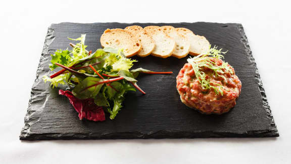 Pour une belle présentation, utiliser un emporte pièce pour le tartare et couper la baguette en diagonale et savourer!