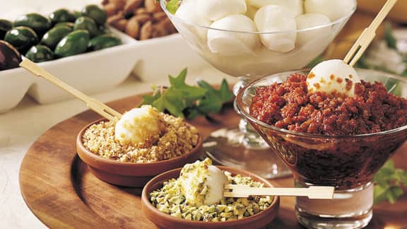 Mettre les bocconcinis cocktail, le pesto, les bâtonnets au sésame et les noix dans des bols séparés.